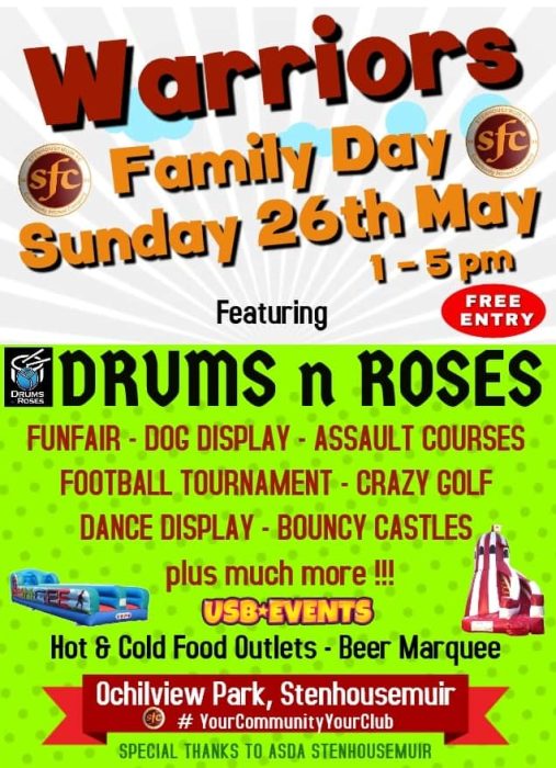 The Warriors Family Day takes place on Sunday 26th May 1-5pm and once again we have an excellent line-up of live acts, inflatables, kids activities, football competitions and food and drink stalls.
