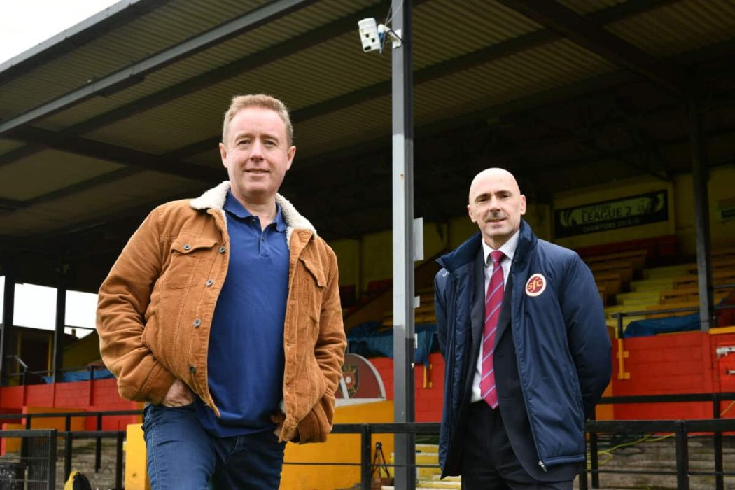 07-09-2020. Picture Michael Gillen. COATBRIDGE. Cliftonhill Stadium.Albion Rovers FC. Scottish Football Tech revolution launch. The Mark Millar Foundation; Stenhousemuir FC and Albion Rovers FC launch new cutting edge AI technology to allow lower league fans in Scotland and around the globe to watch behind closed door matches. Pictured Mark Millar and Iain McMenemy, Chairman Stenhousemuir FC.