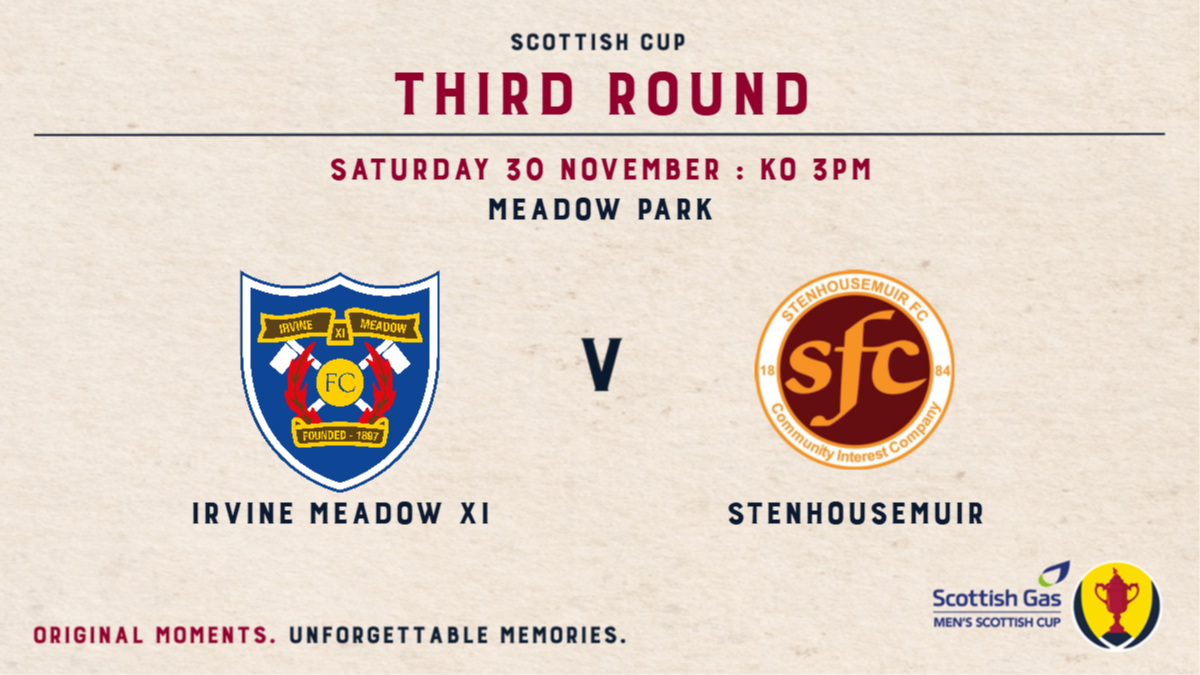 This Saturday we travel to Irvine to take on West of Scotland League First Division side Irvine Meadow XI in the Scottish Gas Scottish Cup Third Round. The match is a 3pm kick off at Meadow Park and pay at the gate prices have been set as: